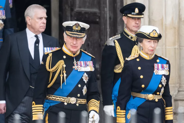 Prince Andrew, King Charles III, Princess Anne and Prince Andrew at Westminster Abbey for the State Funeral of Queen Elizabeth II on September 19, 2022 in London, England.