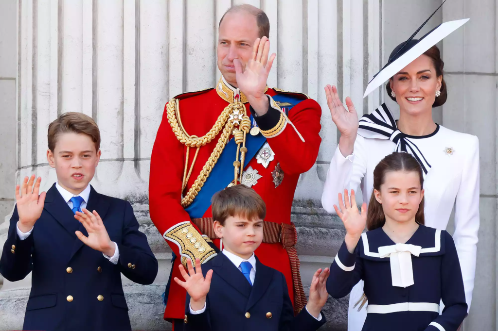 Prince George, Prince William, Prince Louis, Princess Charlotte and the Princess of Wales watch an RAF flypast from the balcony of Buckingham Palace after attending Trooping the Colour on June 15, 2024 in London, England.