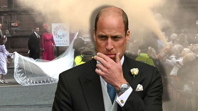 The future King, who was serving as usher for his longtime friend Hugh Grosvenor as he tied the knot with Olivia Henson in Chester on Friday, had just exited the cathedral with the newlyweds when what appeared to be orange fire extinguishers were detonated from the crowd toward the bridal party.