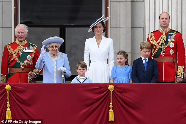 Queen Elizabeth II waves from the Buckingham Palace balcony to tens of thousands of Britons massed down The Mall during her Platinum Jubilee celebrations, June 2022. She stood alongside Prince Charles, Prince William and Kate and their children Prince Louis (centre), Princess Charlotte and Prince George